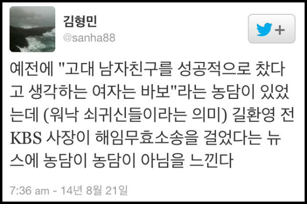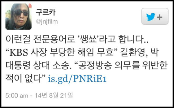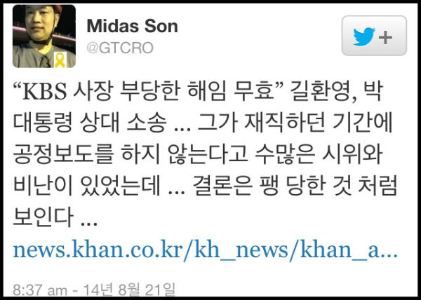 길 전 사장의 소송 소식을 접한 네티즌들은 “아들이 엄마에게 소송하는 꼴이네. 길환영 씨 당신이 정연주 사장으로 착각하나?”(@pao****), “불편부당하게 보도하도록 지시를 했을 뿐?”(@dsk****), “이거 하나만 봐도 박근혜는 권력이 없는 허수아비라는 반증이다. 그 권력을 실제로 향유하고 있는 놈들이 누구겠는가?”(@Gat****)라는 비판을 쏟아냈다.