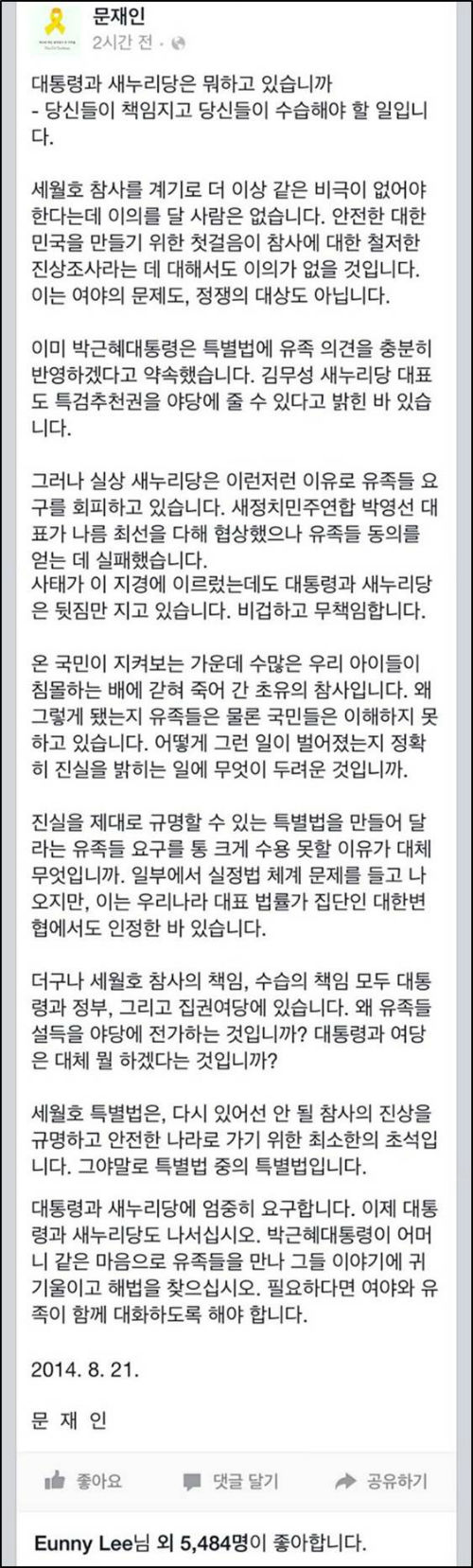 21일 문재인 의원은 자신의 SNS를 통해 “대통령과 새누리당은 뭐하고 있습니까”라는 제목의 글을 올리고 “당신들이 책임지고 당신들이 수습해야 할 일”이라고 쓴소리를 뱉었다.