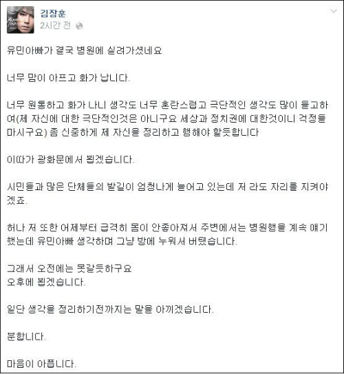 김장훈씨는 22일 오전 자신의 페이스북에 “유민아빠가 결국 병원에 실려가셨네요. 너무 맘이 아프고 화가 납니다”며 속상한 심경을 밝혔다.