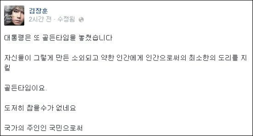 “일단 생각을 정리하기 전까지는 말을 아끼겠습니다”던 김장훈씨는 곧이어 비통한 심경을 참을 수 없다는 듯 “대통령은 또 골든타임을 놓쳤습니다”라며 박근혜 대통령을 강하게 질타했다.