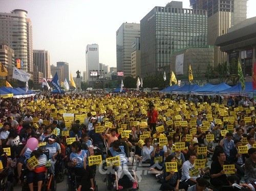 이날 집회에는 시민 2000여명이 참가한 가운데 지난 2년동안 장애등급제와 부양의무제 폐지를 주장하며 광화문에서 농성을 벌여온 장애인단체 등도 함께 했다.