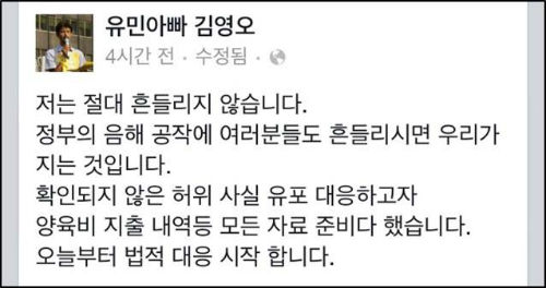 병원에 이송되어서도 44일째 단식 중인 ‘유민아빠’ 김영오씨가 각종 악성 루머에 대해 법적 대응에 나선다는 입장을 표명했다.