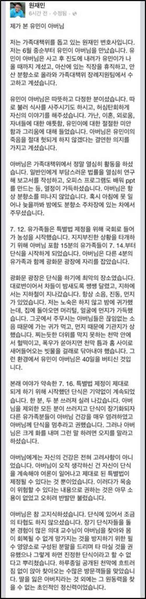 김씨의 이같은 글에 지난 6월부터 가족대책위와 함께 하고 있는 원재민 변호사는 “(김씨로부터) 가난, 이혼, 외로움, 자녀들에 대한 애틋함, 유민이에 대한 절절함과 미안함과 그리움에 대해 들었다”면서 김씨에게 그 동안 행해진 네티즌들의 악성 댓글, 보수 신문 등을 질타했다.