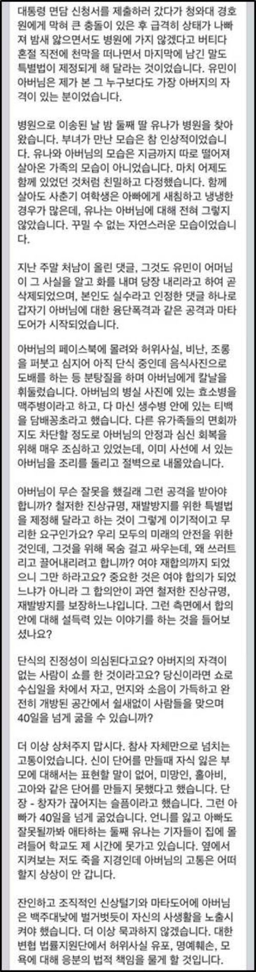 그는 “아버님이 무슨 잘못을 했길래 그런 공격을 받아야 합니까? 철저한 진상규명, 재발방지를 위한 특별법을 제정해 달라고 하는 것이 그렇게 이기적이고 무리한 요구인가요”라고 반문하며 “단식의 진정성이 의심된다고요? 아버지의 자격이 없는 사람이 쇼를 한 것이라고요? 당신이라면 쇼로 수십일을 차에서 자고, 먼지와 소음이 가득하고 완전히 개방된 공간에서 쉴새없이 사람들을 맞으며 40일을 넘게 굶을 수 있습니까?”라고 비난 했다.