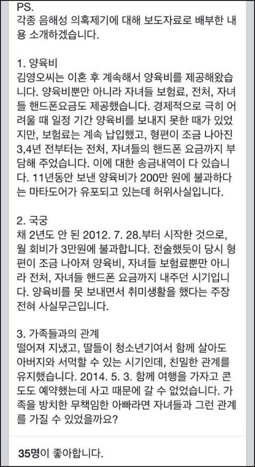 한편, 김씨는 SNS에 양육비 제공에 관한 통장 기록 일부를 공개하고, 취미 생활로 알려진 국궁에 대해서도 월 회비가 3만원에 불과하다는 상세한 설명을 덧붙였다.