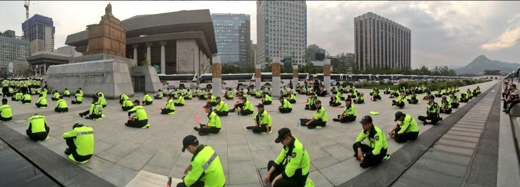 해당 사진에는 더운 여름 한 낮에 의경들로 보이는 경찰들이 광화문 광장에 줄을 맞춰 앉아있다.
