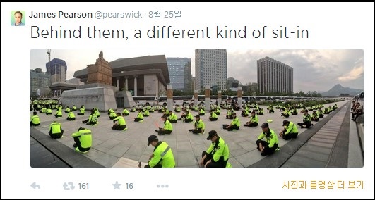 기소권과 수사권이 보장된 세월호 특별법 제정을 촉구하는 단식 농성이 연일 광화문 광장에서 벌어지고 있는 가운데 로이터통신 서울지국 특파원 James Pearson씨가 찍은 의경들 사진이 SNS상에서 화제다.