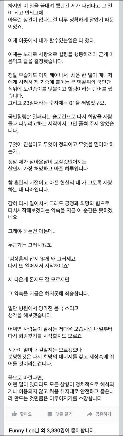 또한 “그 혼란의 정신적 스트레스가 몸이 망가지는 것보다 몇십배 힘들었죠”라며 “어떤 일이 있더라도 모든 상황이 정치적으로 해석되거나 이용되지 않고 처음 취지대로 안전하고 좋은나라 만드는 것만큼은 이루어지기를 소망합니다”라고 말했다.