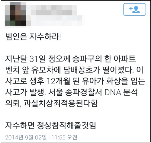 이에 아기 어머니 이모씨는 즉시 경찰에 신고, 해당 아파트 관리 사무소를 통해 ‘경찰이 가해자를 찾는다’는 전단을 부착했다.