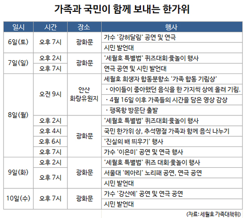 한편, 가족대책위는 추석 연휴 기간인 6~10일 광화문 광장에서 퀴즈대회, 윷놀이, 촛불문화제 등 특별법 제정 관련 행사를 열 계획이다.