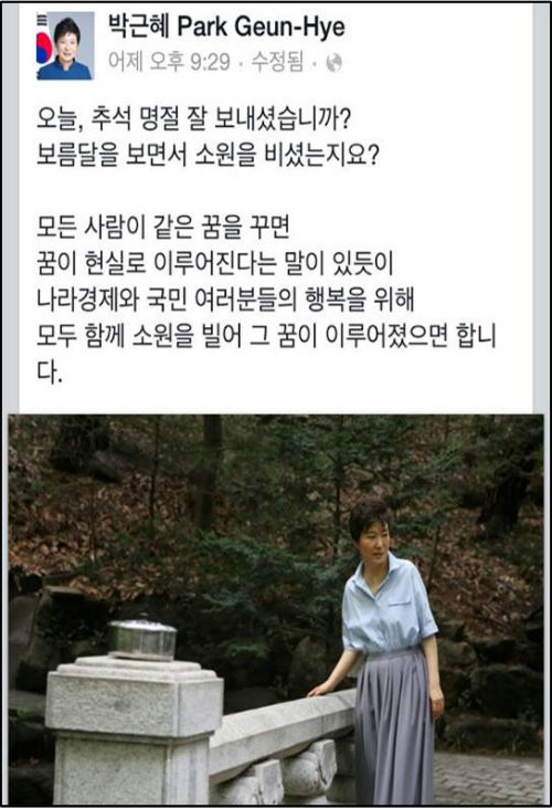 한편, 박근혜 대통령은 8일 밤 자신의 페이스북에 “모든 사람이 같은 꿈을 꾸면 꿈이 현실로 이루어진다는 말이 있듯이 나라 경제와 국민 여러분들의 행복을 위해 모두 함께 소원을 빌어 그 꿈이 이루어졌으면 합니다”라며 이같은 추석 메시지를 남겼다.
