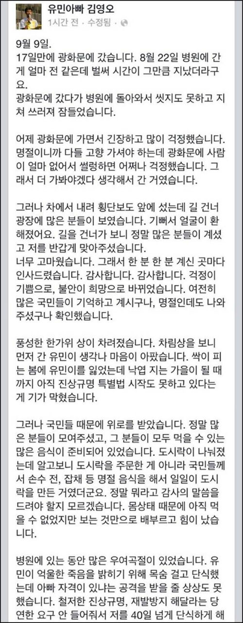 아울러 김씨는 단식 중단 후 입원 치료를 받은지 17일 만인 8일, 추석을 맞아 광화문을 찾은 소감도 전했다.