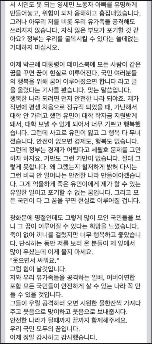 이어 “철저한 진상규명, 재발방지 해달라는 당연한 요구 안 들어줘서 저를 40일 넘게 단식하게 해 시민도 못 되는 영세민 노동자 아빠를 유명하게 만들어 놓고 위협이 되자 음해하고 흠집내었습니다”라며 “자식 잃은 부모가 포기할 것 같아요? 정부는 우리를 굴복시킬 수 있다는 쓸데없는 기대하지 마십시오”라고 특별법 제정을 위한 강한 의지를 밝혔다.