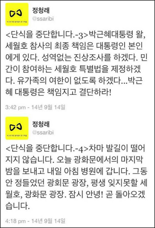 정 의원은 14일 자신의 트위터에 “유민아빠 단식 46일.. 유가족의 고통의 절반이라도 함께 하고자 했으나 어찌 그 아픔의 깊이를 다 알겠습니까?”라며 “못 다한 부분은 밥먹고 더욱 기운내서 세월호 특별법 관철을 위해 국회에서 광장에서 국민과 어깨 걸고 싸우겠습니다”라고 중단을 밝혔다.
