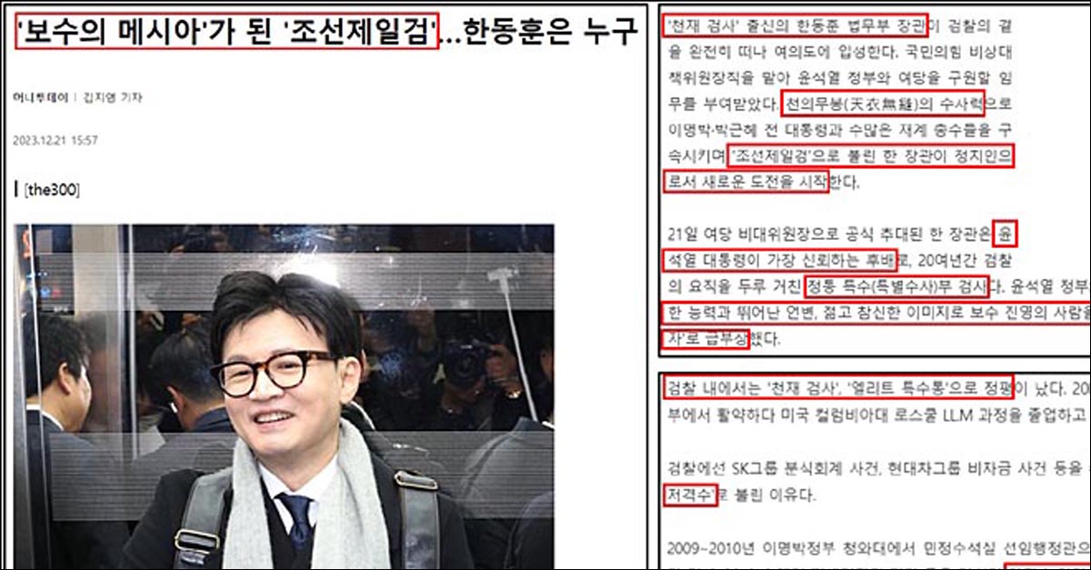 국민일보 <‘조선 제일검’ 불렸던 한동훈…이젠 ‘국민의힘 구원투수’ 등판>(12월 21일 이종선․정우진 기자)은 “엘리트 특수부 검사 출신이라 ‘조선 제일검’이라는 별칭을 얻었던 한 전 장관은 이제 위기에 빠진 국민의힘의 구원투수로 등판”했다고 전하며 “국민의힘이 내년 총선에서 승리할 경우 차기 대권주자 자리를 굳힐 것으로 예상”되지만 “패배한다면 정치 생명이 위기”에 빠질 수 있다고 전망했습니다. 이어 “(더불어민주당이) 오는 28일 국회 본회의에서 이른바 ‘김건희 특검법’을 강행 처리”할 것으로 보인다며, 한동훈 지명자가 “눈앞의 일정부터 가시밭길”을 앞두고 있다고 전했는데요. 국민의힘 비상대책위원장 지명자에 대한 객관적 평가가 아니라, 한동훈 지명자의 앞날을 걱정하는 뉘앙스가 두드러진 것으로 적절하지 않습니다.