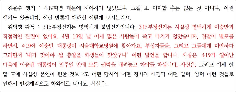 앞서 말했듯, 3‧15부정선거는 이승만 대통령을 필두로 한 자유당 정권이 1960년 3월 15일 제4‧5대 정‧부통령선거에서 대대적인 선거부정행위를 자행한 사건입니다. 김덕영 감독은 “(4‧19혁명에서) 경찰이 발포를 하면서” 많은 사람들이 죽고 다쳤고 “4‧19에 이승만 대통령이 서울대학교병원에 찾아가” 부상자들을 위문했다고 주장했는데요. 왜곡된 주장입니다.