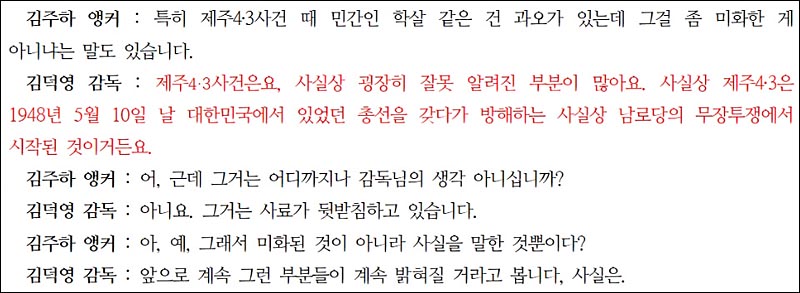 김주하 앵커가 “제주4‧3사건 때 민간인 학살”을 건국전쟁에서 미화한 게 아니냐는 지적이 있다고 질문하자, 김덕영 감독은 “제주4‧3은 1948년 5월 10일 날 대한민국에서 있었던 총선을 갖다가 방해하려는 사실상 남로당의 무장투쟁에서 시작된 것”이라고 단언했습니다. 김주하 앵커는 “그거는 어디까지나 감독님의 생각” 아니냐고 물었지만 김덕영 감독은 “그거는 사료가 뒷받침”하고 있다고 답했고 추가질문은 없었습니다.