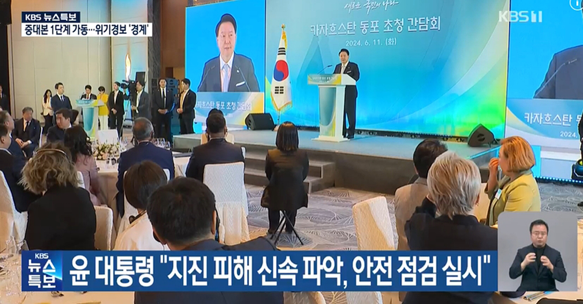 KBS는 지진 발생 당시 모습과 피해 상황을 짚은 뒤 5번째 꼭지 <윤 대통령 “피해 상황 신속 파악‧안전 점검 실시”>(6월 12일)에서 “중앙아시아 3개국을 순방 중인 윤석열 대통령은 전북 부안 지진 상황을 보고받고, ‘피해 상황을 신속하게 파악하고 안전점검을 실시하는 등 제반 조치를 취할 것’을 지시”했으며 “‘추가적인 여진 발생에 대해 국민들이 불안해하지 않도록 관련 정보를 지속적으로 신속‧정확하게 전파하고, 비상대응태세를 점검하라’고 관계 기관들에 당부”했다고 보도했습니다. KBS는 이날 저녁종합뉴스 외에도 지진 직후 오전 뉴스특보에서도 대통령의 지진 관련 지시‧당부 사항을 단신 리포트로 전했습니다.